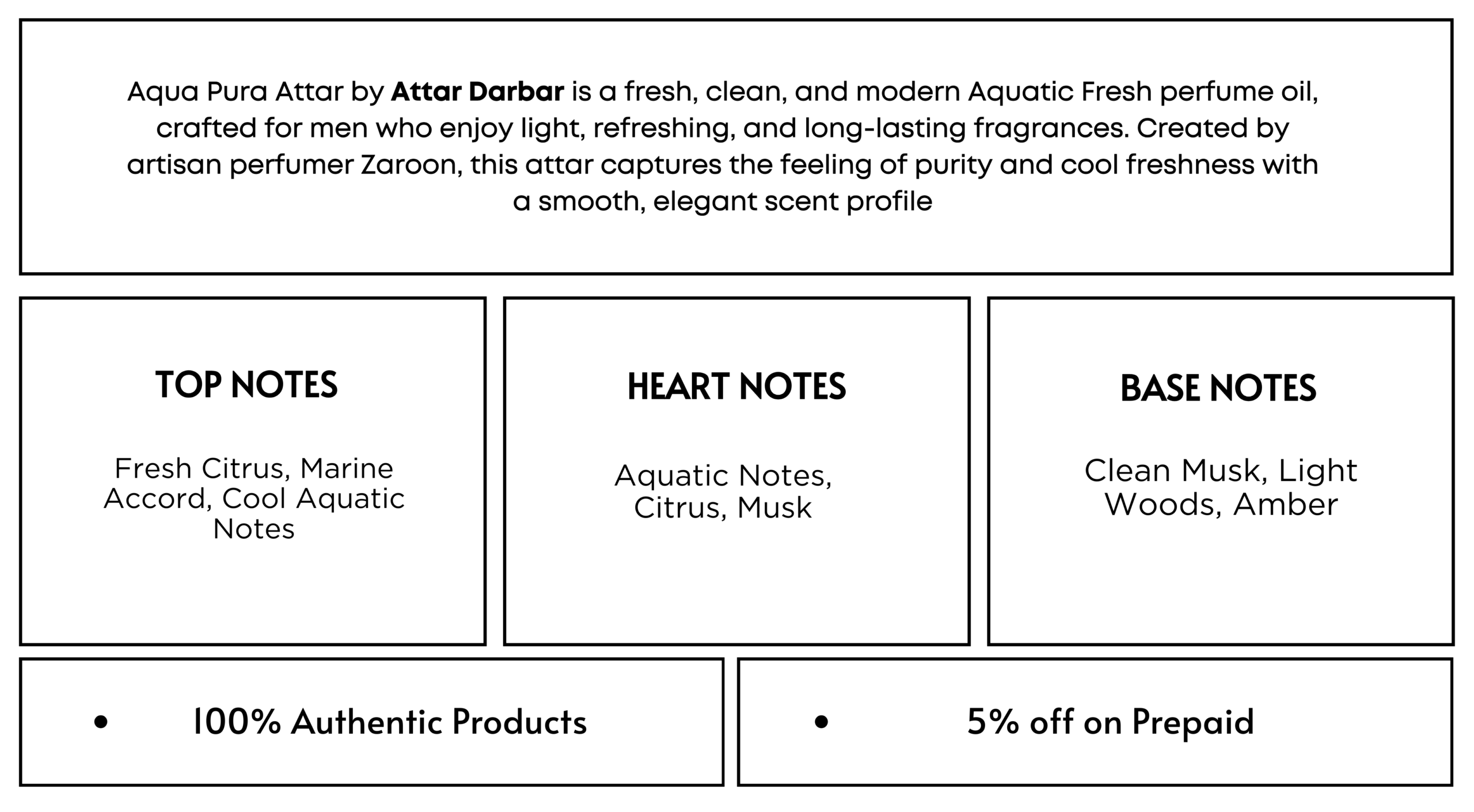 Aqua Pura Attar by Attar Darbar is a fresh, clean, and modern Aquatic Fresh perfume oil, crafted for men who enjoy light, refreshing, and long-lasting fragrances. Created by artisan perfumer Zaroon, this attar captures the feeling of purity and cool freshness with a smooth, elegant scent profile.