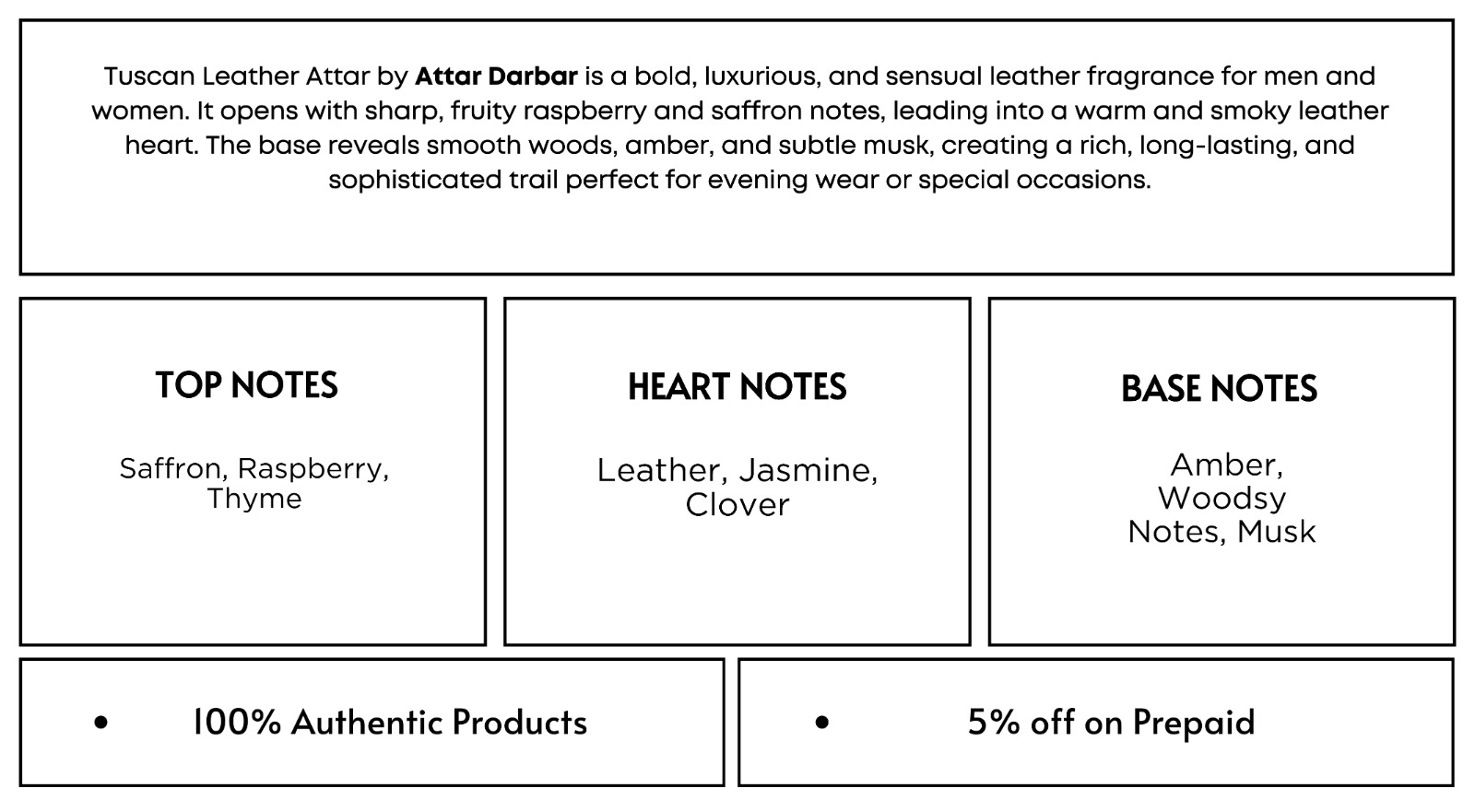 Step into a world of raw luxury with Tuscan Leather Attar, a masterpiece from Attar Darbar. This bold and sensual leather fragrance is a sophisticated choice for both men and women who command attention. Combining the ruggedness of smoky leather with the sweetness of ripe fruit, it creates an opulent aura that is perfect for formal evening wear and high-profile special occasions.